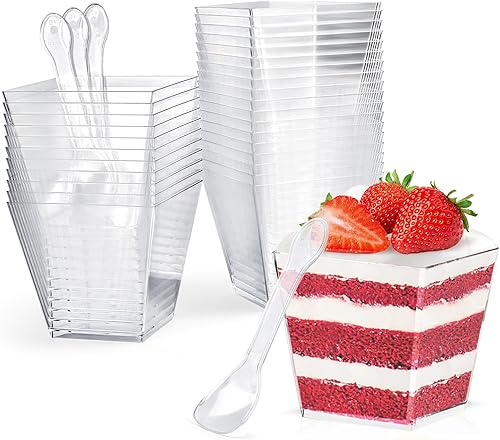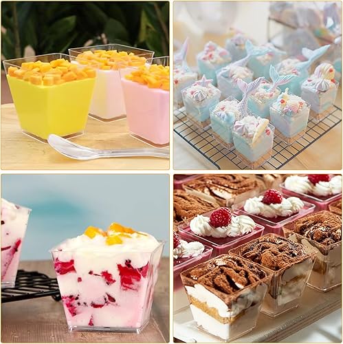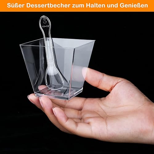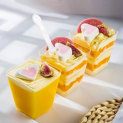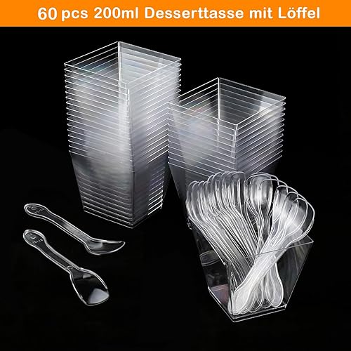 CoKeeSun 60 Pièces Tasses à Dessert avec Cuillères, Verrine Plastique Gobelets à Dessert Carrés 200ml/7oz, pour Pudding, Mousse, CrèMe Glacée, Anniversaire, Mariages