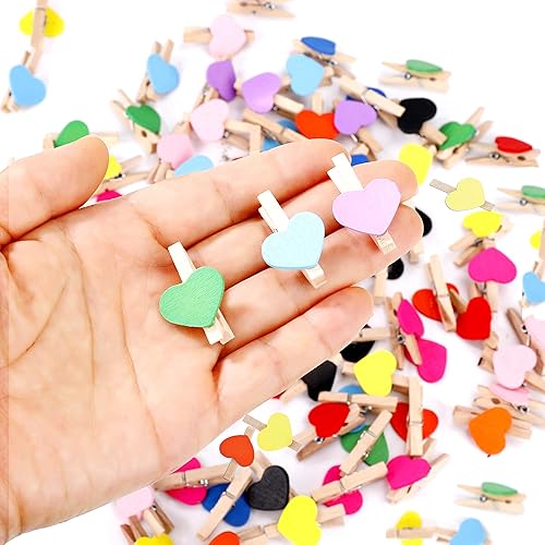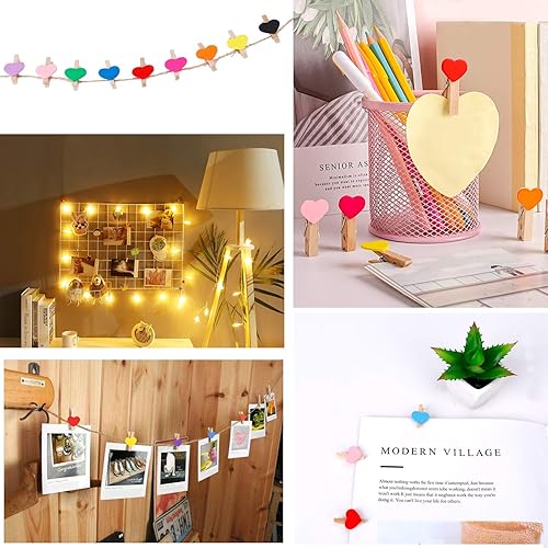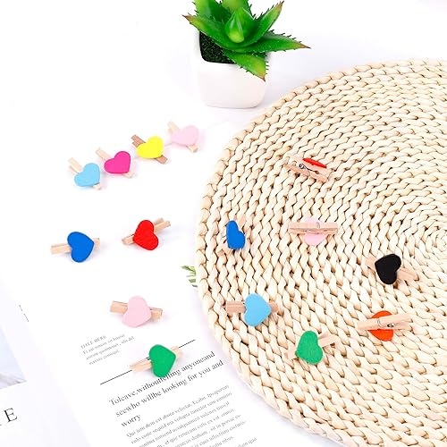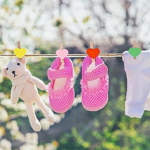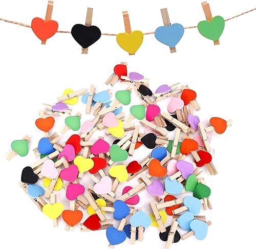 Pince à Linge en Bois Mini Coeur Clips Photos avec Ficelle de Jute 30m pour Décoration de Carte de Titulaire de Photo de Fête de Mariage et Bricolage Décoration 100 Pieces Coloré