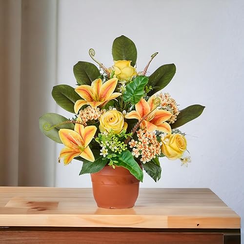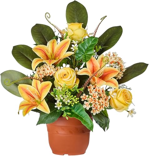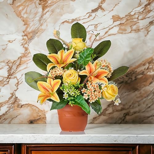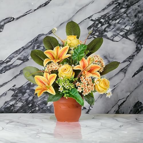 Fleur Artificielle Jaune et orange Avec Vase Lesté | Composition florale Lys Et Rose | Fleurs artificielles déco | Plantes Artificielles Interieur Extérieur | Fleur Artificielle cimetiere | Décoration