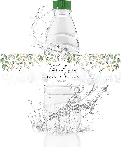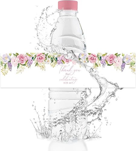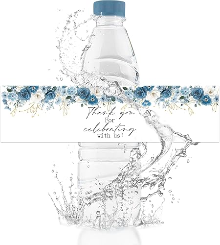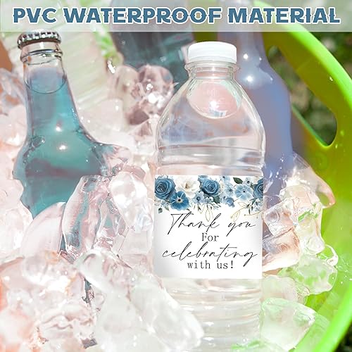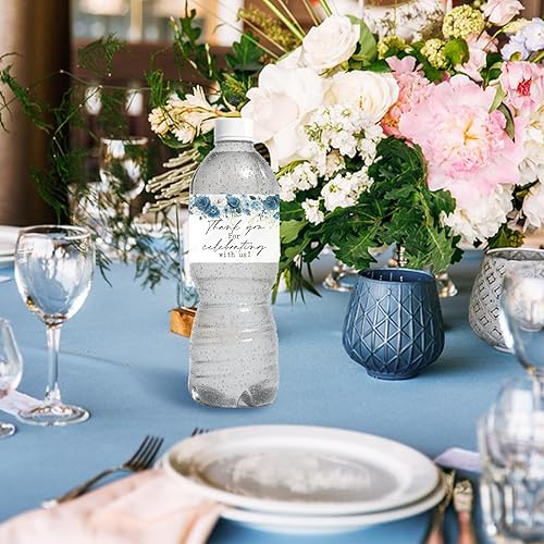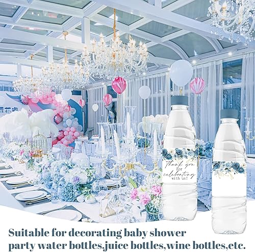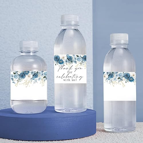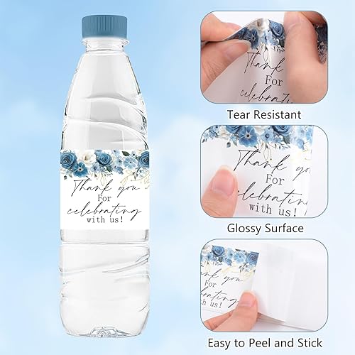 URROMA Lot de 50 étiquettes pour bouteille d'eau, motif fleurs bleues et blanches, autocollants de remerciement, estampage à chaud, feuilles imperméables pour fête prénatale