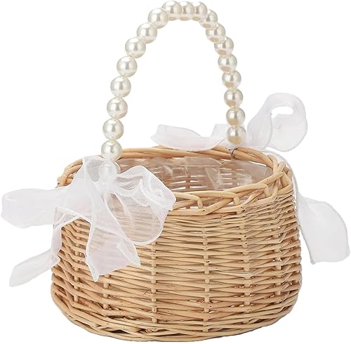 Bvizyelck Panier en osier avec poignée, panier de fille de fleur de perle - Panier de pétales de mariage avec poignée en perles et ruban d'arc - Panier de Pâques en rotin tissé à la main, féerique,