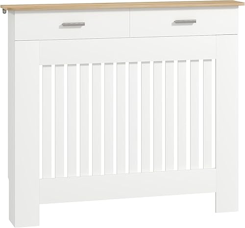 HOMCOM Cache-radiateur à lattes anti-inclinaison avec tiroir de rangement, Cache-radiateur en bois, 112x19x97 cm, Blanc