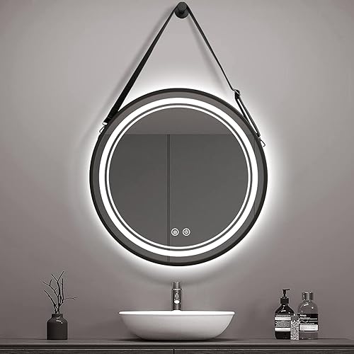 Agrichamer Miroir de salle de bain rond à LED avec anti-buée, 3 températures de couleur et intensité variable en continu, miroir mural pour lavabo avec sangle, miroir rétroéclairé sur le devant (60 cm