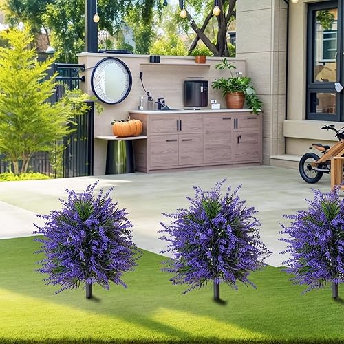 Lot de 2 boules de buis artificielles de lavande - 50 cm - Résistantes aux UV - Plantes décoratives pour extérieur et intérieur - Avec piquet pour jardin, terrasse, balcon, entrée