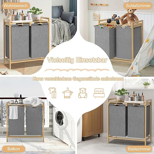 UISEBRT Panier à linge en bambou avec 2 compartiments, 72 l, en tissu Oxford, système de tri du linge amovible et lavable, 73 x 64 x 33,5 cm, gris