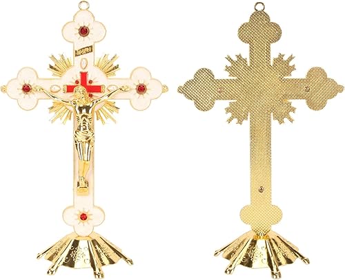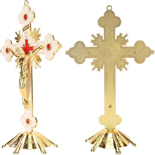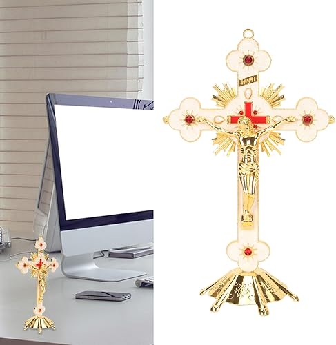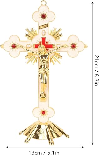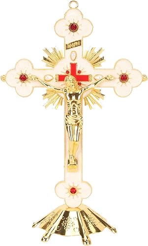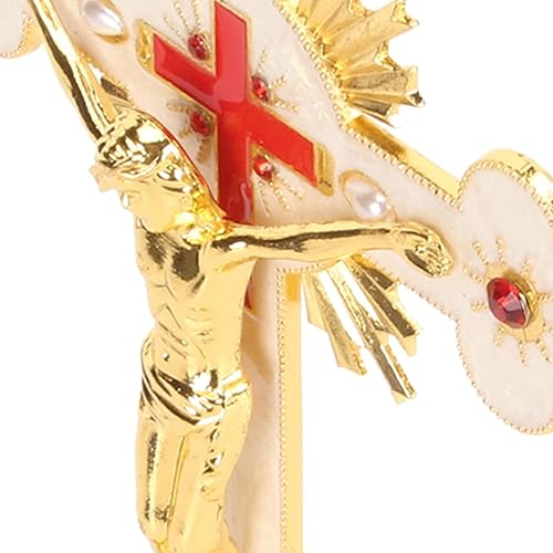 Fockety Crucifix Debout, Exquise Rétro Élégante Croix Debout en Métal, Croix De Crucifix De Décoration De Rouge avec Base, Croix De Jésus Catholique Stable Durable De Longue