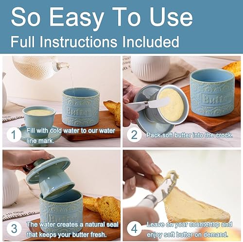 beurrier à eau, Beurre Pot en Porcelaine, beurrier en céramique, beurrier eau avec couvercle, Plat à Beurre français, beurriers vintage, butter dish avec Couvercle en Relief pour Beurre Mou - Bleu