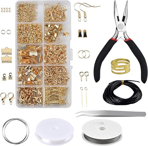 Fangehong Kit Fabrication de Bijoux, Bijoux Faisant Kit, Conclusions Fermoirs de Homard Anneaux de Saut Cordons Pince à Épiler pour Réparation Outils de Bijoux Collier Bracelet DIY Artisanat (Or)