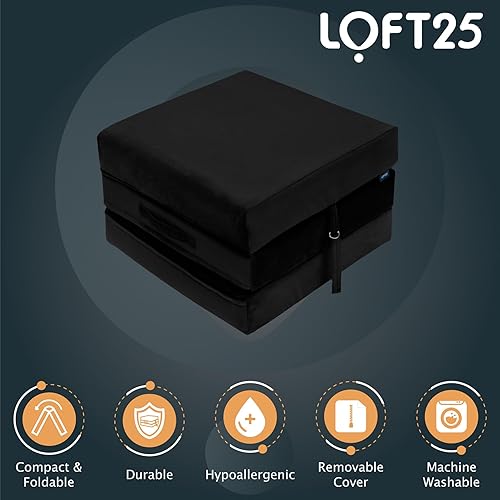 Loft 25 Lit Z simple pliable | Matelas en forme de Z pliable en velours | Pour invités de salon, chambre à coucher | Canapé-fauteuil confortable durable et léger | Pouf futon confortable (noir)