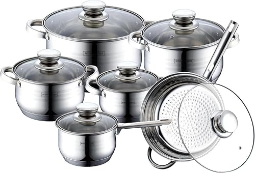 Royalty line Batterie de Cuisine en Acier Inoxydable à 5 Couches,18 pièces, Poêle à Frire, Casserole et Marmite avec Couvercle en Verre, Casseroles Adapté à la Tous Feux Dont Induction (Argent) (13)