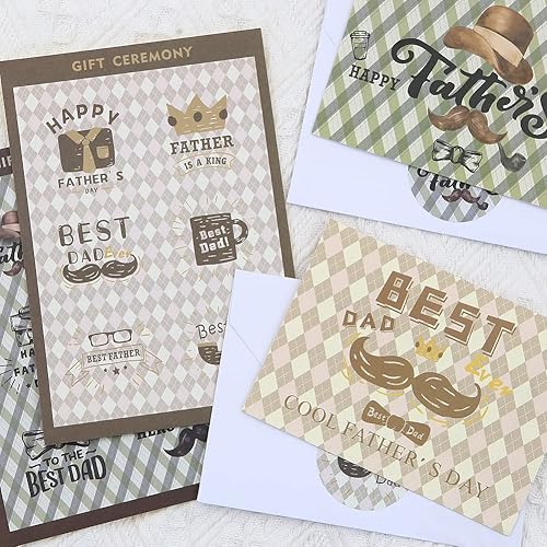 Papier Cadeau Fête des Pères Papier Cadeau Plié à Carreaux Rétro 6 Feuilles 50x70cm Recyclable Barbe Cravate Chapeau Horloge Motif Papier Cadeau pour Papa Grand-Père avec Autocollants Enveloppe Carte
