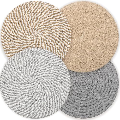 Lot de 4 dessous de plat ronds de 20 cm - Tapis de tissage en coton - 4 couleurs - Théière - Dessous de plat - Support de casserole - Maniques pour cuisine, bol, casserole, poêles