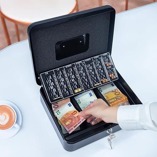 iggual - Tiroir Caisse Noir Résistant, Caisse à Monnaie pour les Magasins, Marchés, Écoles, 8 Compartiments Inclinés pour Pièces et 3 pour Billets, Poignée de Transport et Mousse de Sécurité, 2 Clés