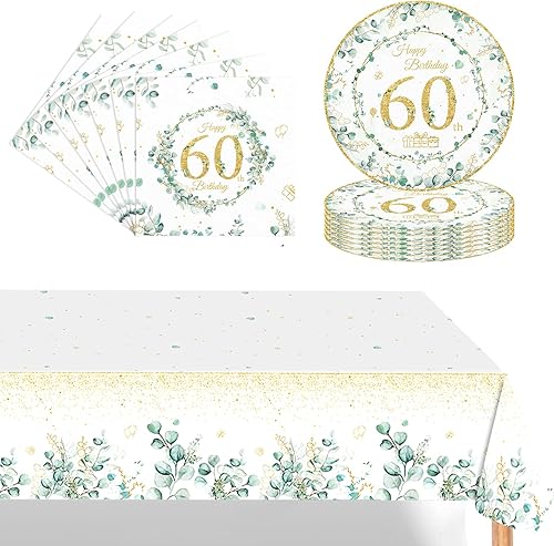 POPOYU 37 Pièces Assiette Vaisselle Anniversaire Kit,Vert sauge Decoration Anniversaire Vaisselle 60 Ans Femmes Hommes,Nappe Papier Assiette Serviette pour Decoration Anniversaire 60 Ans Cadeau