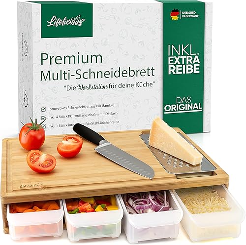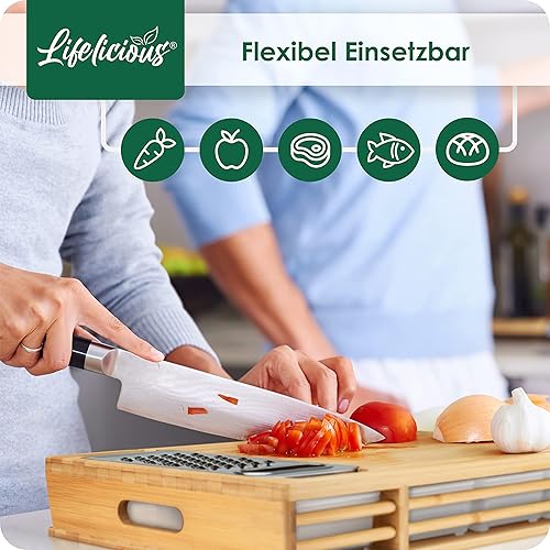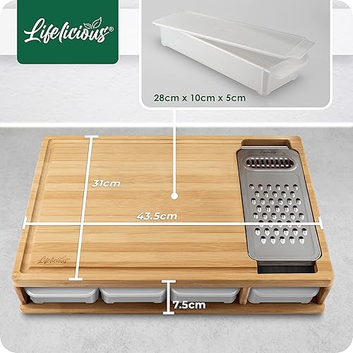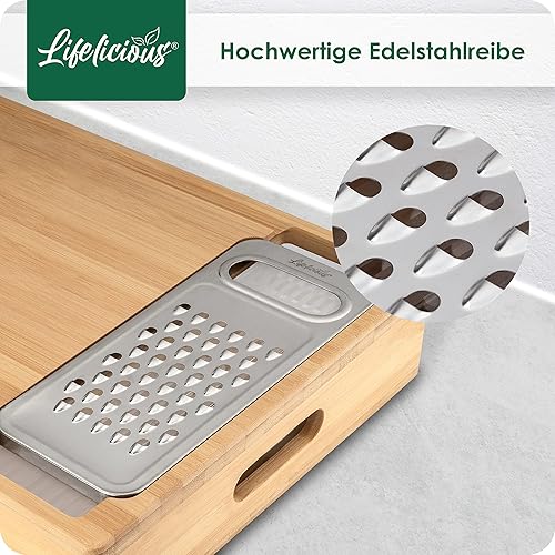 LIFELICIOUS® - Planche à découper de qualité supérieure avec bac récupérateur [avec râpe en acier inoxydable] Bols en plastique lavables au lave-vaisselle - Grande planche de cuisine