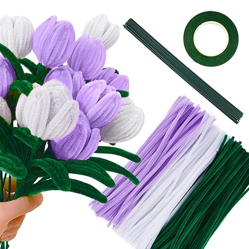 300pcs Fil Chenille Bouquet de Tulipes, Tige de Chenille avec 3 Couleurs Cure-Pipes Chenille+20pcs Tiges de Fleurs pour DIY Décoration Travaux Manuels, Artisanat Créatif Creatifs