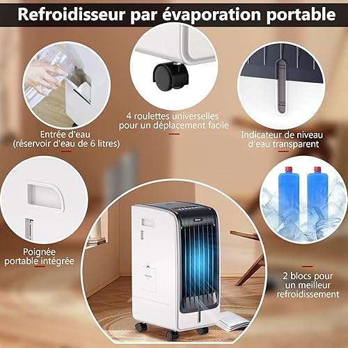 RELAX4LIFE Refroidisseur d'air Portable 3-en-1 avec Minuterie, 3 Mode de Vent, 65 W Ventilateur Mobile Roue universelle avec Réservoir d'Eau de 7L pour Bureau, Maison
