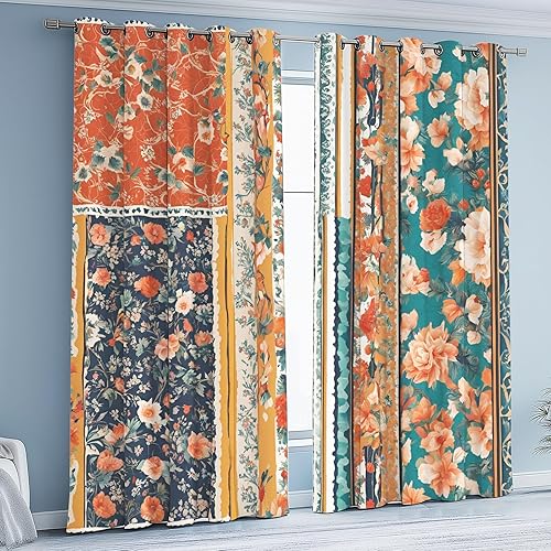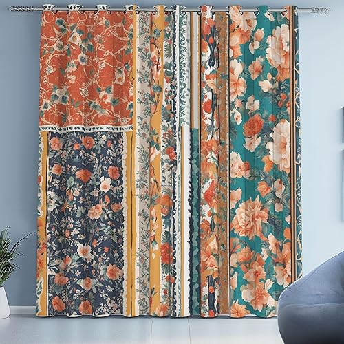 Vintage Boho Cuisine Voilages Intérieurs Motif Floral Patchwork Rideaux Salon Chambre Feuilles de Plantes Occultants Rideau 140L X 240H cm Thermique Isolant Anti Froid Anti Bruit, Lot de 2 à Oeillets