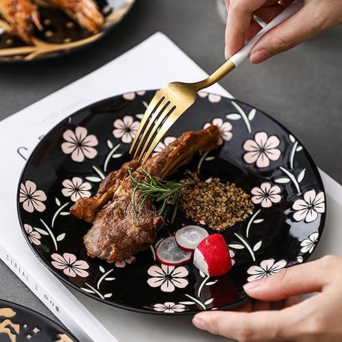 fanquare Lot de 6 Assiettes à Dessert en Fleurs de Cerisier Japonaises de 20cm, Ensemble de Assiettes en Porcelaine Noire, Assiette à Pâtes à Salade