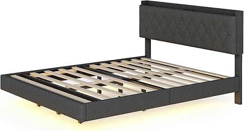PUGSDRLY Lit Double avec Rangement 140x200cm, Rembourré avec Lumières LED à Couleurs Changeantes et Prise USB, Adulte, Tissu de Lin, Sans Matelas (Beige)