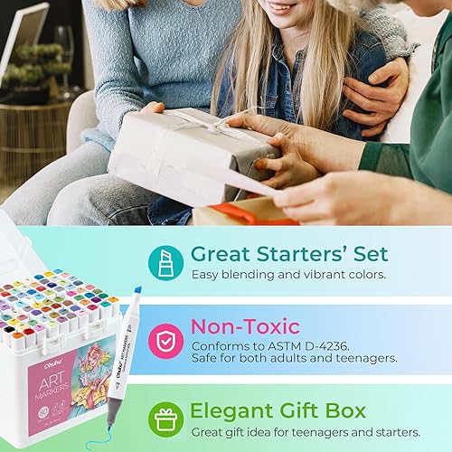Ohuhu Marqueurs à alcool, 80 couleurs de marqueurs à double pointe + 1 mélangeur incolore, biseau et marqueur fin à base d'alcool pour adultes, artistes débutants, coloriage, illustration, esquisse