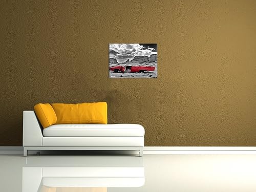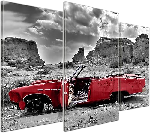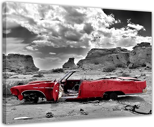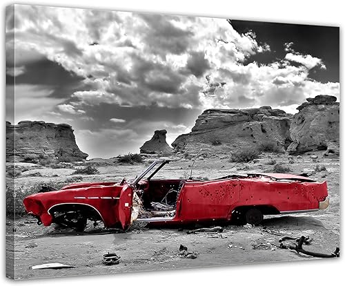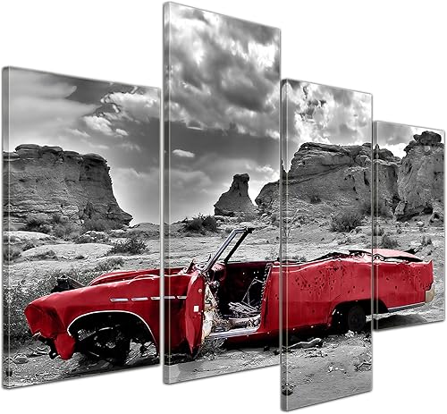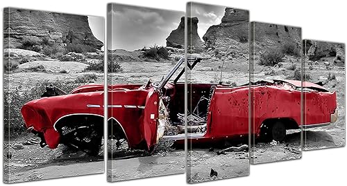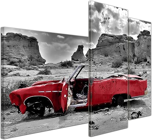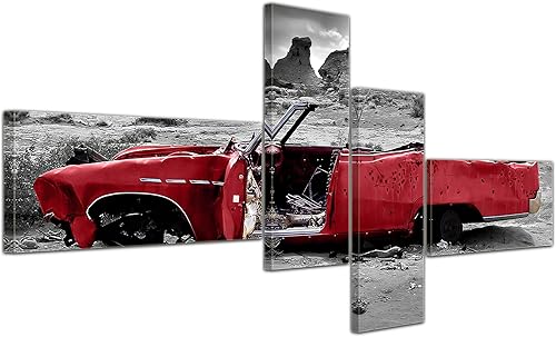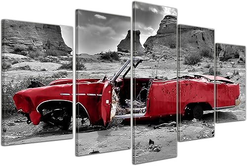 Bilderdepot24 Impression d'art - Cadillac - Rouge - Image sur Toile - 200x80 cm 5 pcs - Toile Photos - Murale de Motorisé - Amérique - Paysages - Carcasse dans Le désert