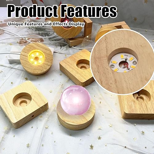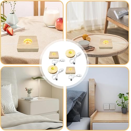 Lot de 4 socles lumineux LED en bois - USB - Pour verre acrylique - Couleur chaude - Base en bois - Carré / rond - Pour cristal, verre, acrylique - Bijoux en résine (carré)
