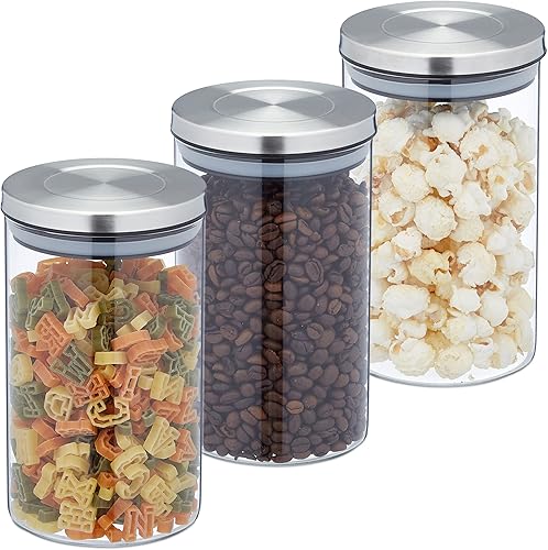 Relaxdays Lot de 3 bocaux en Verre, Volume 800 ML, Couvercle INOX, Bocal Conservation, céréales, pâtes, Riz, Transparent