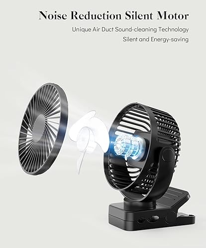 QEEKADA Ventilateur portable à clip 12 000 mAh, rechargeable, 5 vitesses, pince robuste pour bureau, chariot de golf, tente, salle de sport, noir