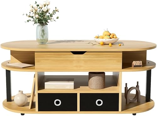 Zepneiy Table Basse Moderne en Grain de Bois avec Fonction relevable, Espace de Rangement et tiroirs en Tissu Noir – Polyvalente, élégante et Pratique pour Le Salon et Le Bureau