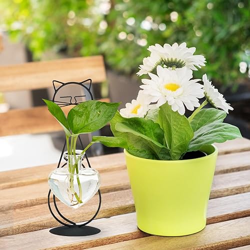 Vase à fleurs en verre en forme de cœur, vase de multiplication hydroponique avec chat, support de plantes en métal intérieur, station de multiplication pour plantes, support de fleurs de bureau pour