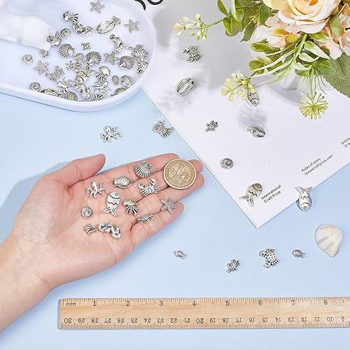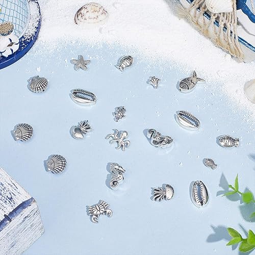 HOBBIESAY 60Pcs perles Sur le Thème de L'Océan en Argent Antique en Métal 14 Styles Motif Poisson Créatures Marines Tibétaines pour la Fabrication de Bijoux DIY Trou: 1-4mm