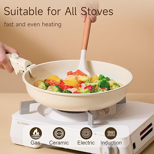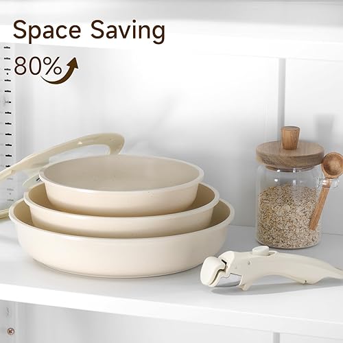 JEETEE Set de Poêles à Frire 6 Pcs, Poêle à Frire Antiadhésive Avec Poignée Amovible et Lid, Poêle 20/24/28 cm Facile À Nettoyer Et Compatible Toutes Les Cuisines, PFOA/PFOS Free, Beige
