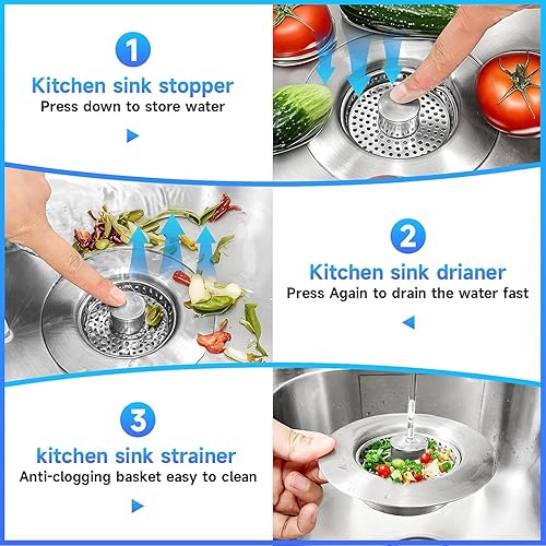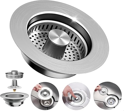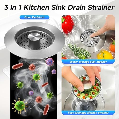 Bouchon Evier Cuisine, Passoire 3 en 1 pour évier De Cuisine Et Bouchon De Lavabo,en Acier Inoxydable 304,Trou De 75 à 86 mm, Profondeur 40 mm,Crépine D'évier De Cuisine Amovible