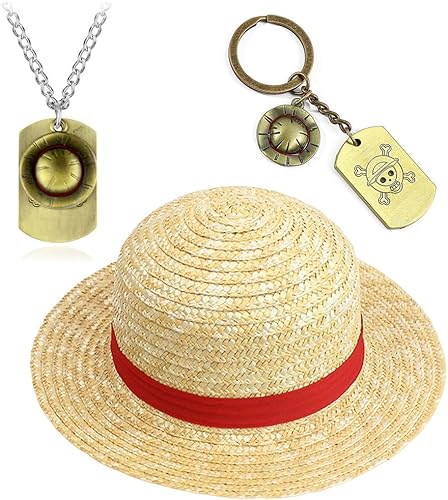 ZGCXRTO 3 PCS Casquette Pirate en Paille,Porte-clés chapeau de pirate Collier,One P Chapeau de paille,Chapeau de Soleil,Casquette Pirate en Paille,Porte-clés Pirates,pour Cosplay Anime Manga