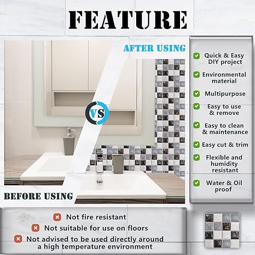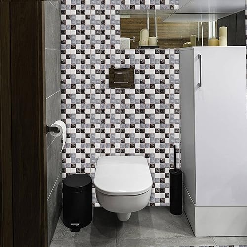 Cendray 20 PCS Adhésifs pour carrelage, antihuile imperméable PVC autocollant décoration, style mosaïque cuisine autocollants pour carrelage pour salle de bain - Design lisse gris noir (10 x 10 cm)