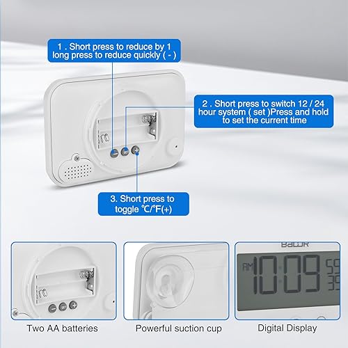 Jasfyee Hygrometre,Minuteur Douche Imperméable Horloge Salle De Bain, Horloge Digitale avec Ventouse,Grand Écran Numérique LED avec Compte À Rebours, Alimenté par Pile, pour Maquillage Cuisine