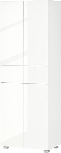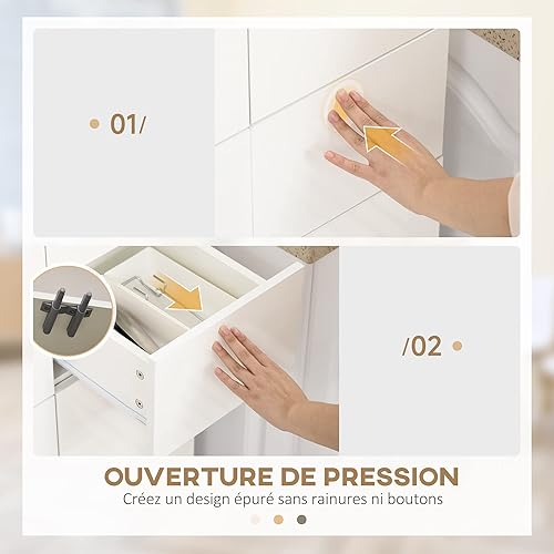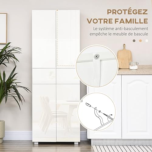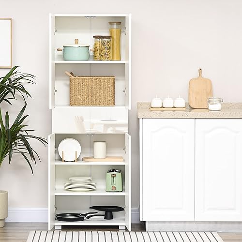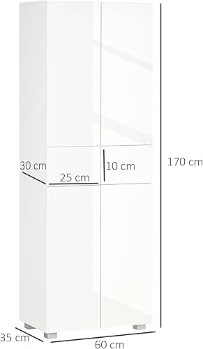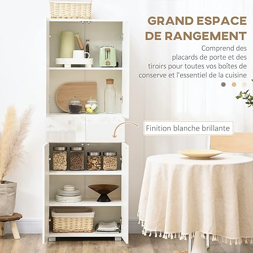HOMCOM Armoire Cuisine Buffet de Cuisine Haut Meuble de Rangement avec 4 Portes Ouvertes par poussée, 2 tiroirs et des étagères réglables Style Moderne 60 x 35 x 170 cm Blanc laqué