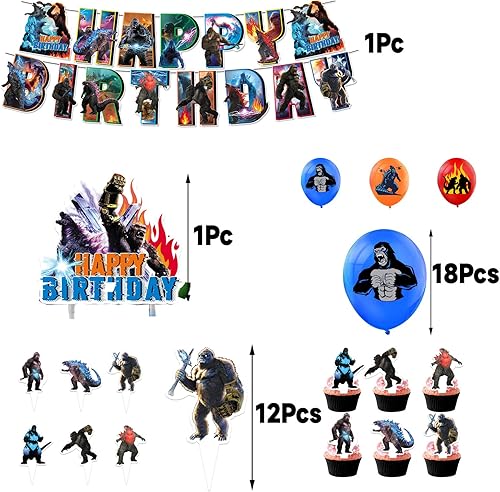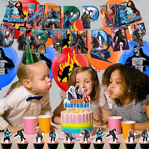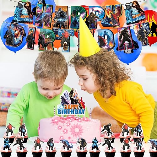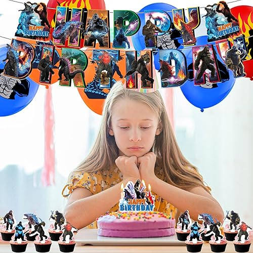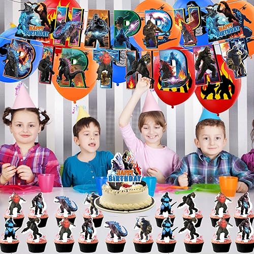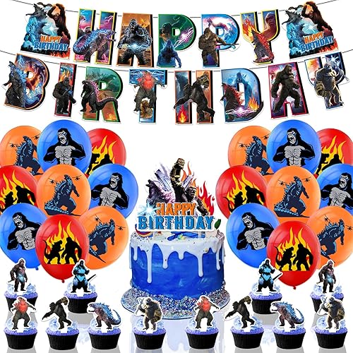 Godzilla Kit de décoration d'anniversaire Godzilla avec ballons, décoration de gâteau, bannière d'anniversaire pour enfants