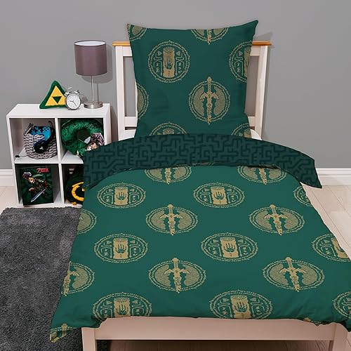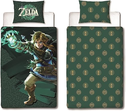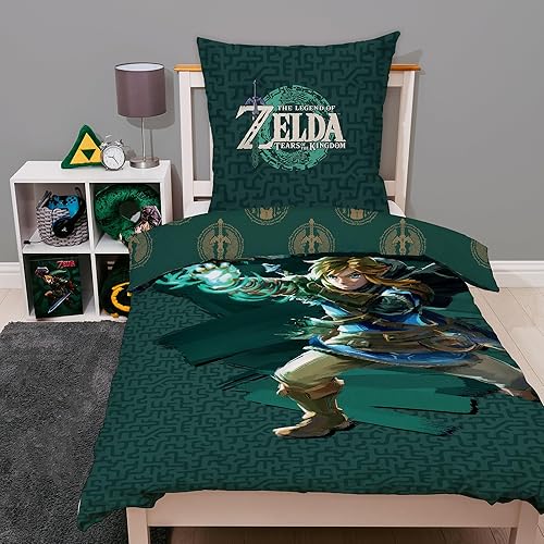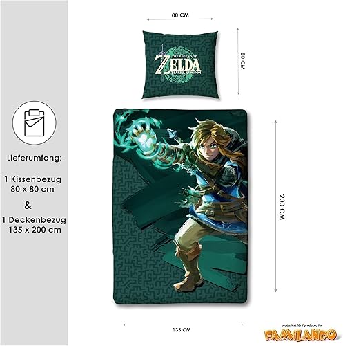 Familando The Legend of Zelda Parure de lit pour enfants et adolescents - Parure de lit pour enfant - Vert - 135 x 200 cm - 80 x 80 cm - 100 % coton - Avec fermeture éclair - Motif Tears of The