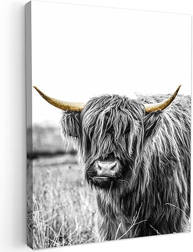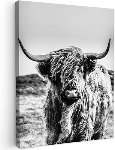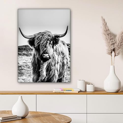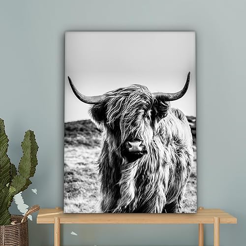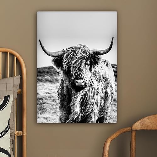 MuchoWow Toile Vache - Highlander écossais - Noir - Blanc - Animal - Nature - Vie sauvage - Decoration murale - 60x80 cm - Tableaux de salon - Deco chambre - Peinture