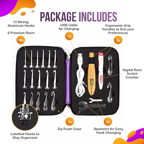 Ensemble crochet et poignée de comptage – 18 crochets lumineux en aluminium et plastique – Prise en main confortable et ergonomique – Avec marqueur numérique LED pour point de rangée de doigts – Kit
