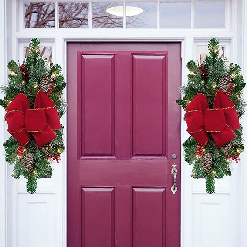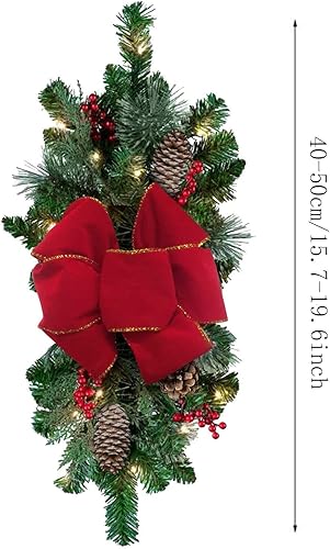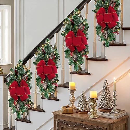 Couronne d'Escalier Pré-éclairée Avec Lumières Sans Fil - Décoration Classique de Noël pour Escaliers, Cheminées, Jardin (Rouge #2 Avec Lumière)
