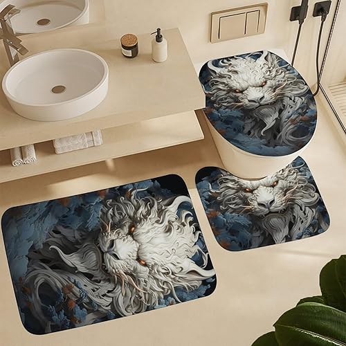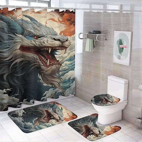 AEMYSKA Ensemble de rideau de douche avec tapis et tapis de bain, motif dragon de ferme, motif animaux anciens, tapis antidérapant, housse pour abattant de toilette et tapis de bain, rideau