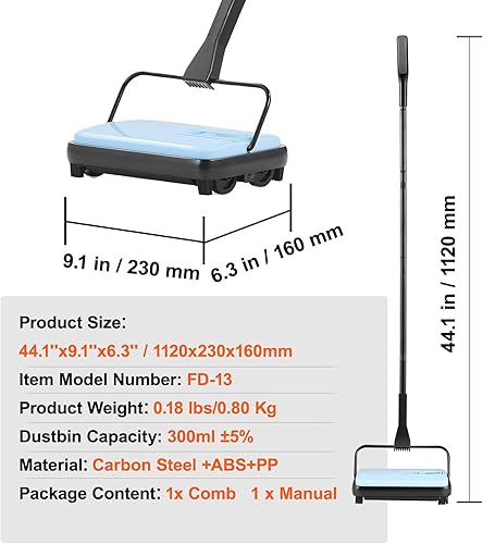 VEVOR Balai Mécanique Largeur de Balayage 170 mm, Balayeuse Manuelle pour Planchers et Tapis avec Bac à Poussière 300 ML Facile à Vider, Nettoyeur de Sols sans Électricité pour Bureau Maison, Rouge