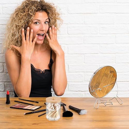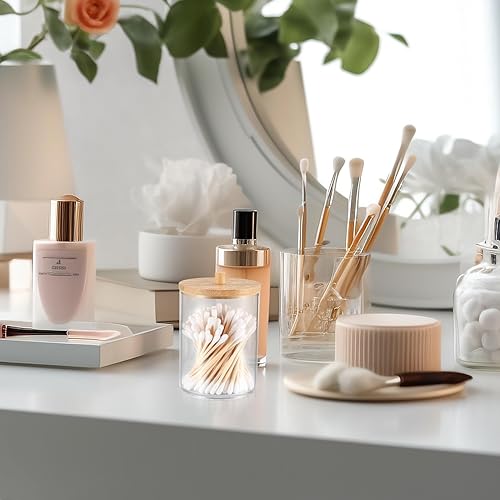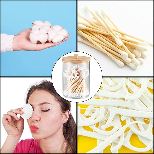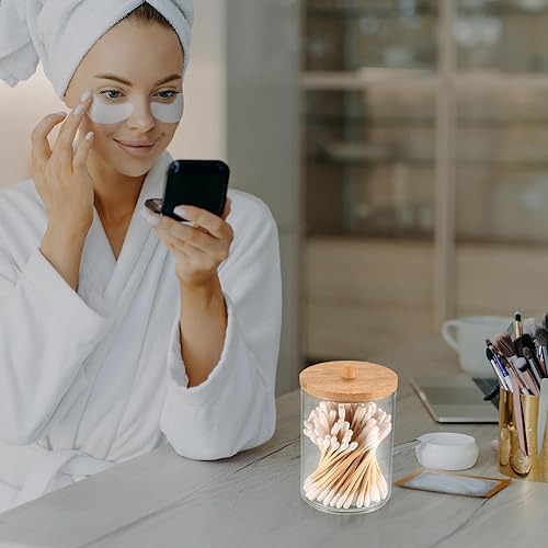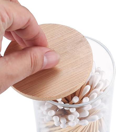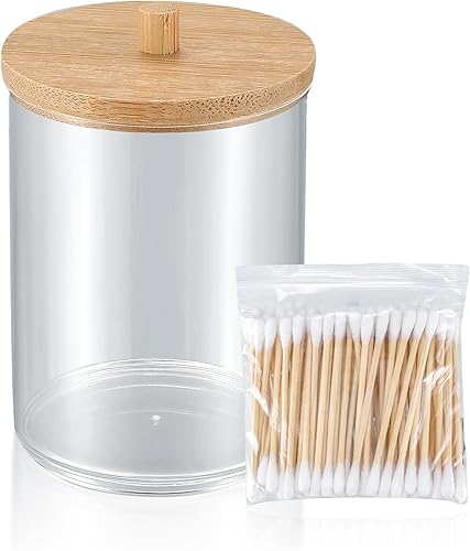 Boîte à Coton-Tige, Distributeur Support de Rangement pour Porte-Qtip/Tampons de Coton/Boule de Coton, avec Bambou Couvercle, pour Vanité de Salle de Bain, avec 100 Cotons-tiges - Rond