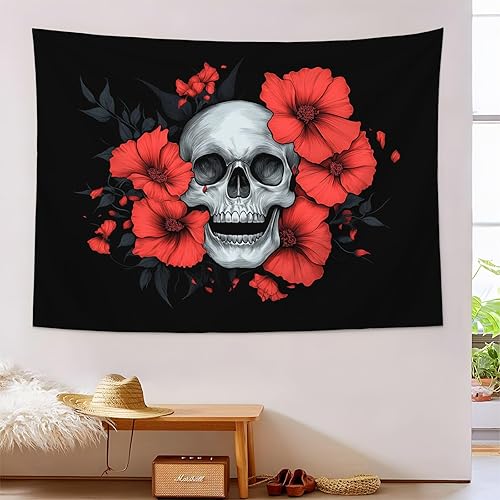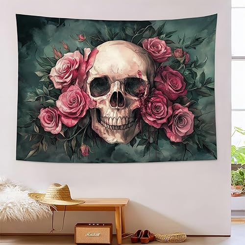 Tenture Murale Vert Foncé Crâne Rose Tapisserie Murale Esthétique Gothique 100X150Cm Réutilisable Tissu Mural Wall Art Tapestry Décoration Poster Pour Chambre Salon Fête Dortoir