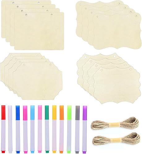 Lot de 16 panneaux en bois, 2 cordes de chanvre, 12 stylos colorés, copeaux de bois suspendus multicolores, panneaux de porte en bois, panneaux vierges à faire soi-même, panneaux suspendus en bois