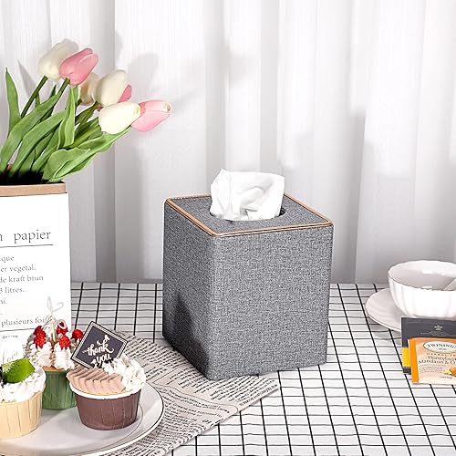 BTSKY Boîte à mouchoirs carrée en lin avec ligne dorée décorative – Porte-papier de soie cubique – Support de rangement pour mouchoirs en papier, boîte à serviettes, gris