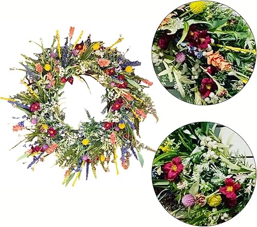 Couronne de fleurs sauvages - Guirlande de printemps - Pour porte d'entrée - Guirlande de fleurs séchées simulées - Couronne de porte - Décoration de la maison pour l'intérieur et l'extérieur - 35 cm